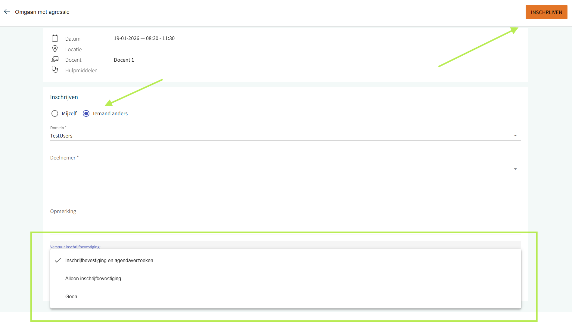 Nadat je hebt geklikt op inschrijven, vul je in het volgende scherm de velden in. Maak een keuze uit de drie opties bij het versturen van de inschrijfbevestiging. Met de knop 'inschrijven' worden ze ingeschreven. Indien je meerdere medewerkers wilt inschrijven, kun je de optie 'Na verwerking nog een medewerker' aanvinken.