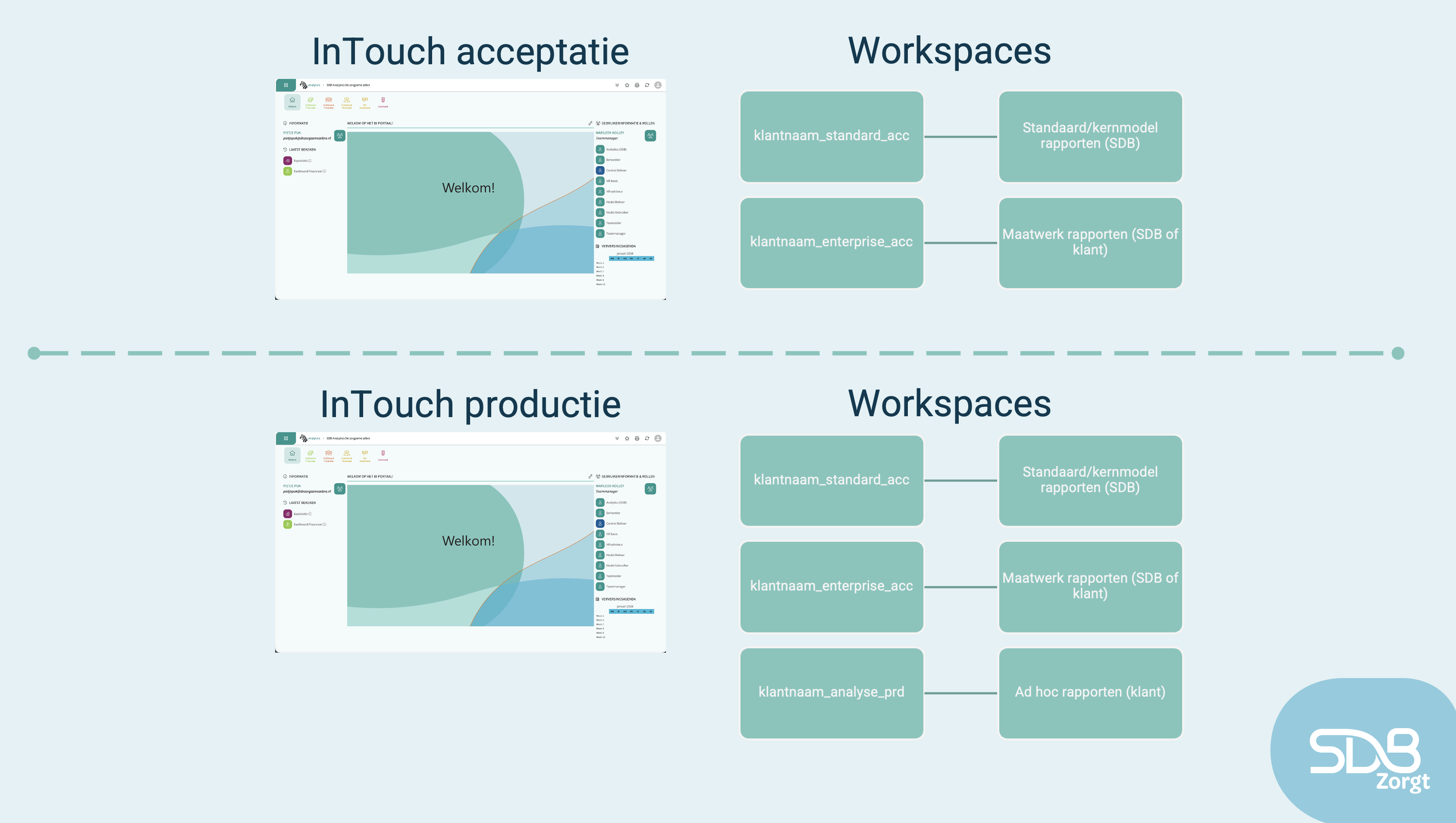 Op moment dat je (als klant) zelf rapporten bouwt doe je dat in eerste instantie in de [...]_enterprise_acc werkruimte. Op moment dat zo'n rapport via een InTouch pagina gepresenteerd wordt aan één of meerdere rollen én het rapport getest en akkoord bevonden is kan dit geheel uitgerold worden naar de InTouch productie omgeving met bijbehorende [...]_enterprise_prd werkruimte. Dit uitrollen gebeurd op basis van een Power BI pipeline welke door SDB ingericht en beheerd wordt.