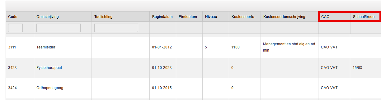 In Beheer | Organisatie | Functie kun je per functie een default CAO, schaal en trede vastleggen. (bedragen worden niet getoond)