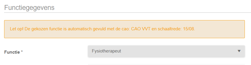 Bij het kiezen van een functie in het instroom mutatieformulier worden – indien aanwezig – de CAO en salarisschaaltrede automatisch gevuld.