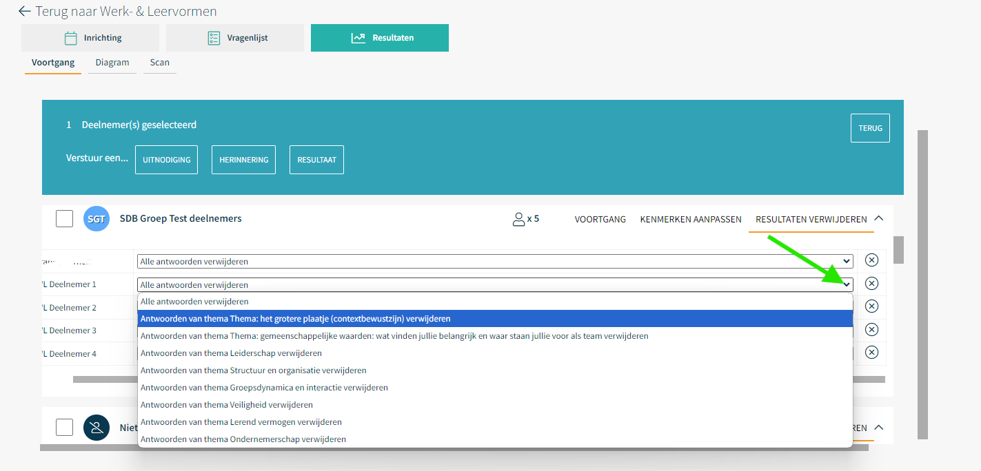 Je kunt als Expert de ingevoerde antwoorden voor één of meerdere deelnemers verwijderen bij een Leer- en ontwikkelscan.