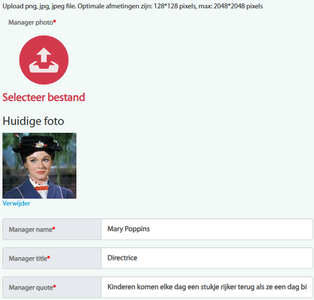 Je kunt hier een foto toevoegen, een naam, een functie(titel) en een quote.
