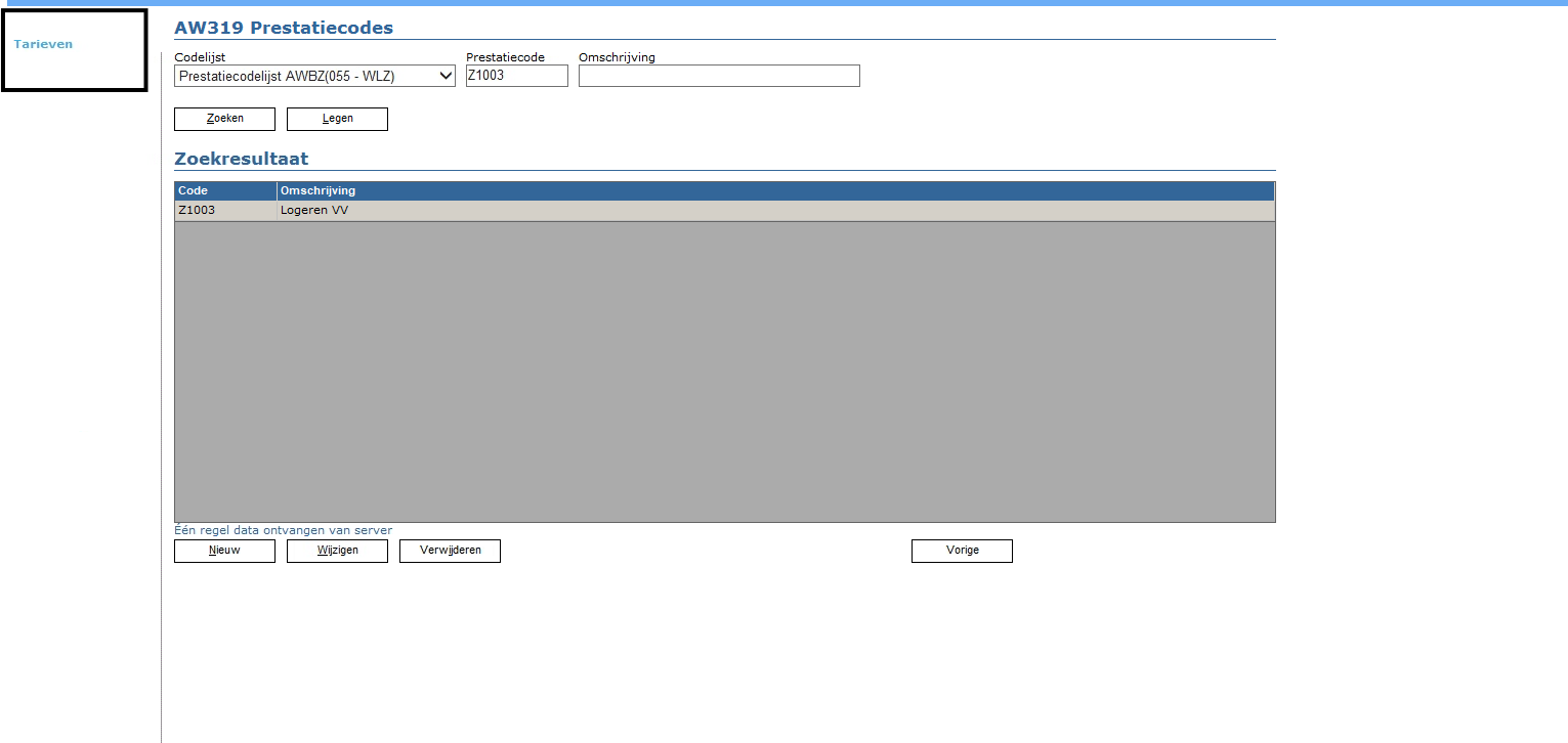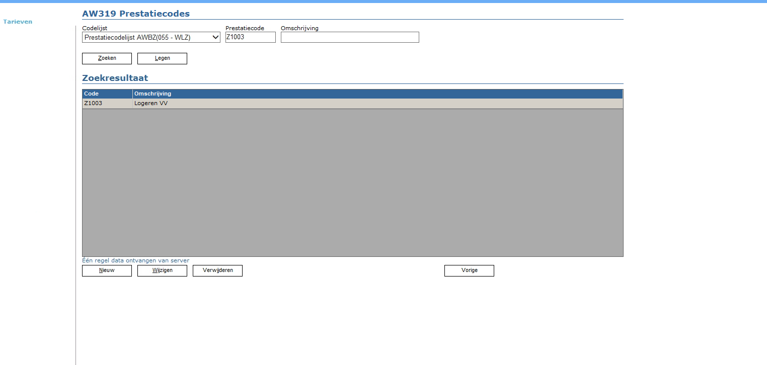 Inrichting van de prestatiecode: Beheer > stambestanden> AW319 prestatiecodes > AWBZ prestatiecodes:
