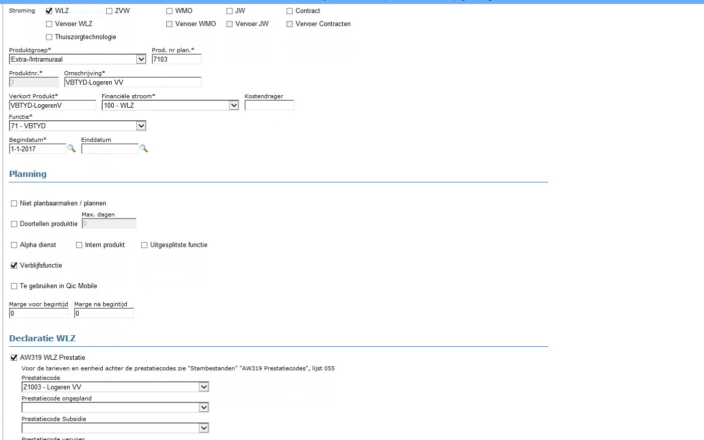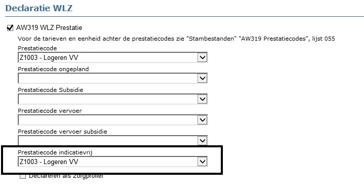 Er zijn klanten welke de prestatiecode ongepland mogen aanleveren, hier vul je voor ook bij AW319 WLZ prestatie ook het veld prestatiecode ongepland: