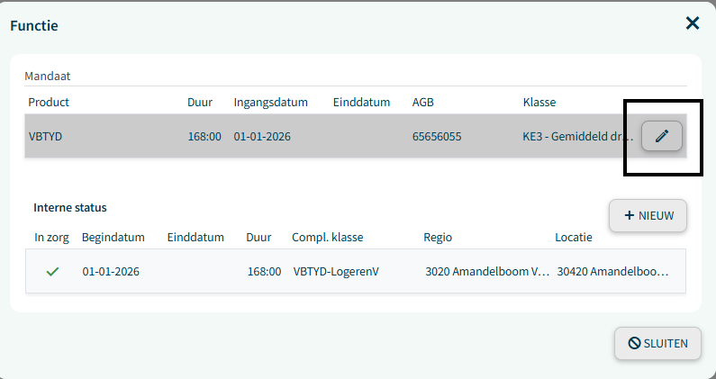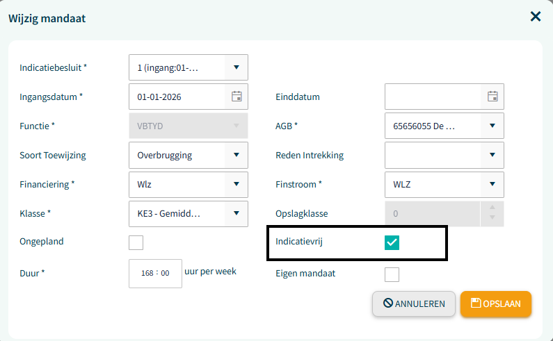 Als de functie is aangemaakt en je mag als organisatie logeren als indicatie vrij declareren dan open je de functie en wijzig je het mandaat en vink je indicatie vrij aan: