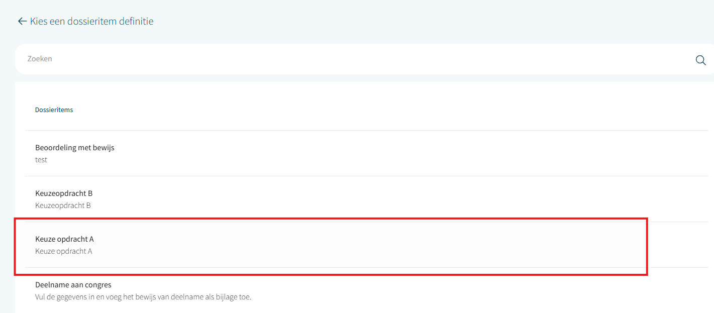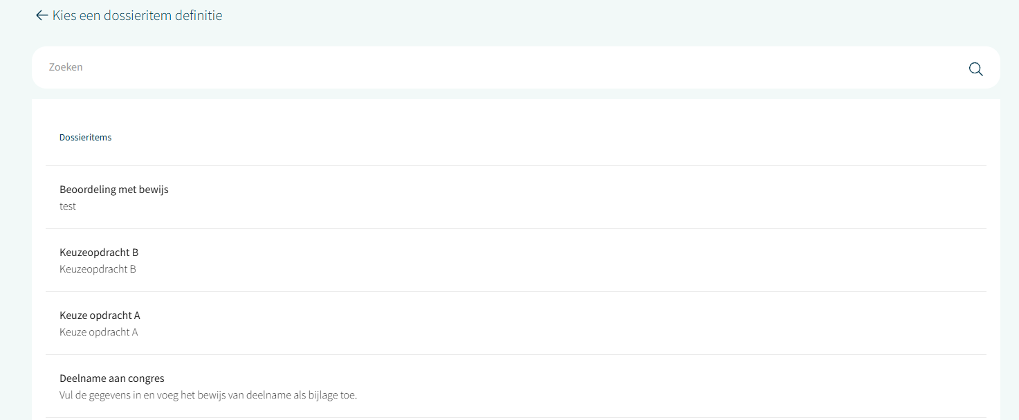Selecteer het gewenste dossieritem type die bij de activiteit hoort die onderdeel is van de bekwaamheid om verder in te vullen.