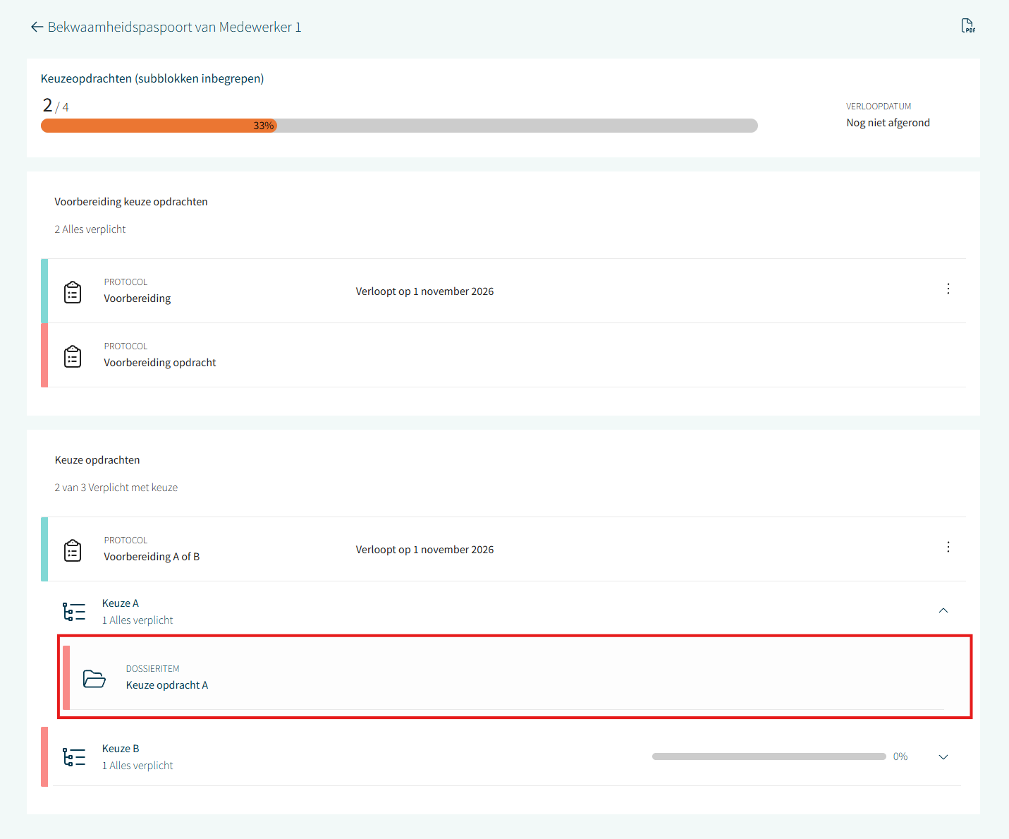 Dossieritems kunnen ook onderdeel van een activiteit binnen bekwaamheid zijn waarbij je via het bekwaamheidspaspoort op een activiteit doorklikt en in je dossier het gevraagde item aan te leveren. Een verplicht dossier item, als onderdeel van een bekwaamheid, heeft net als andere activiteiten een status.