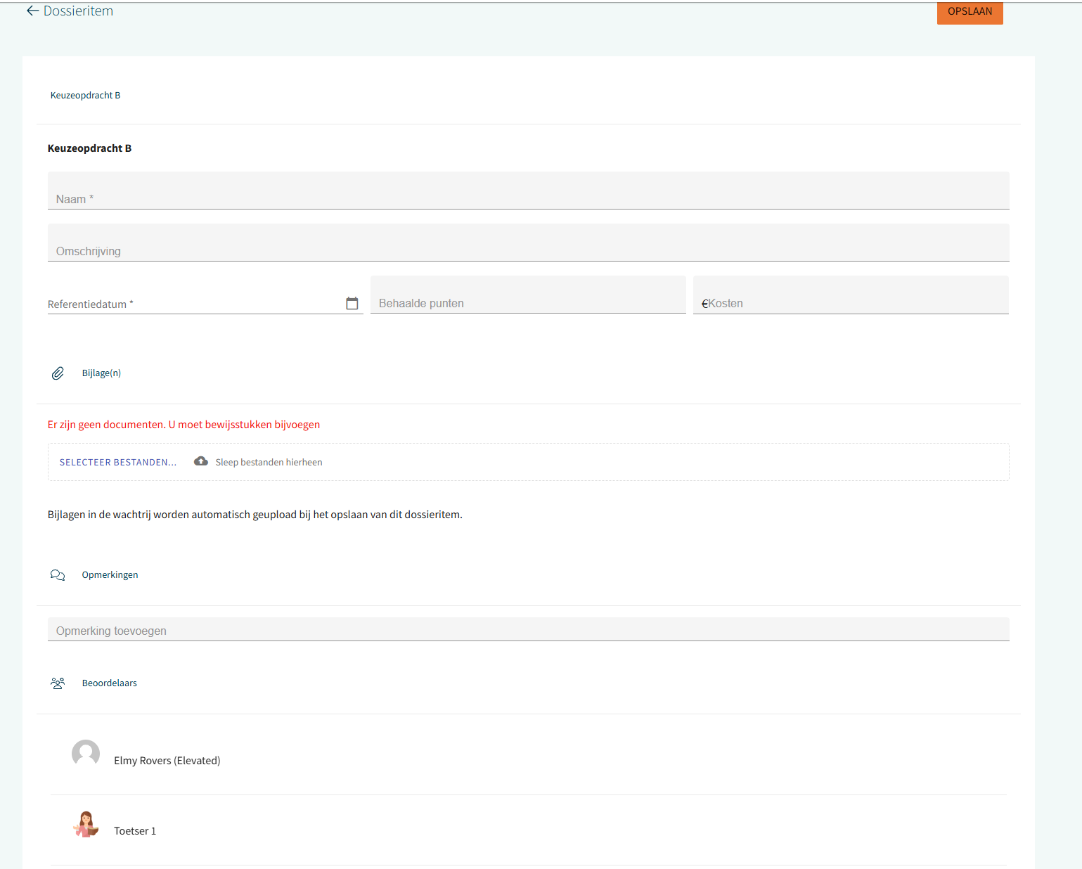 Als het dossieritem is ingesteld met een beoordelaar, worden onderaan de beschikbare beoordelaars weergegeven. Bij het opslaan kun je een beoordelaar kiezen die het dossieritem voor je beoordeelt. Waar nodig kunnen zowel jij als de beoordelaar opmerkingen toevoegen.