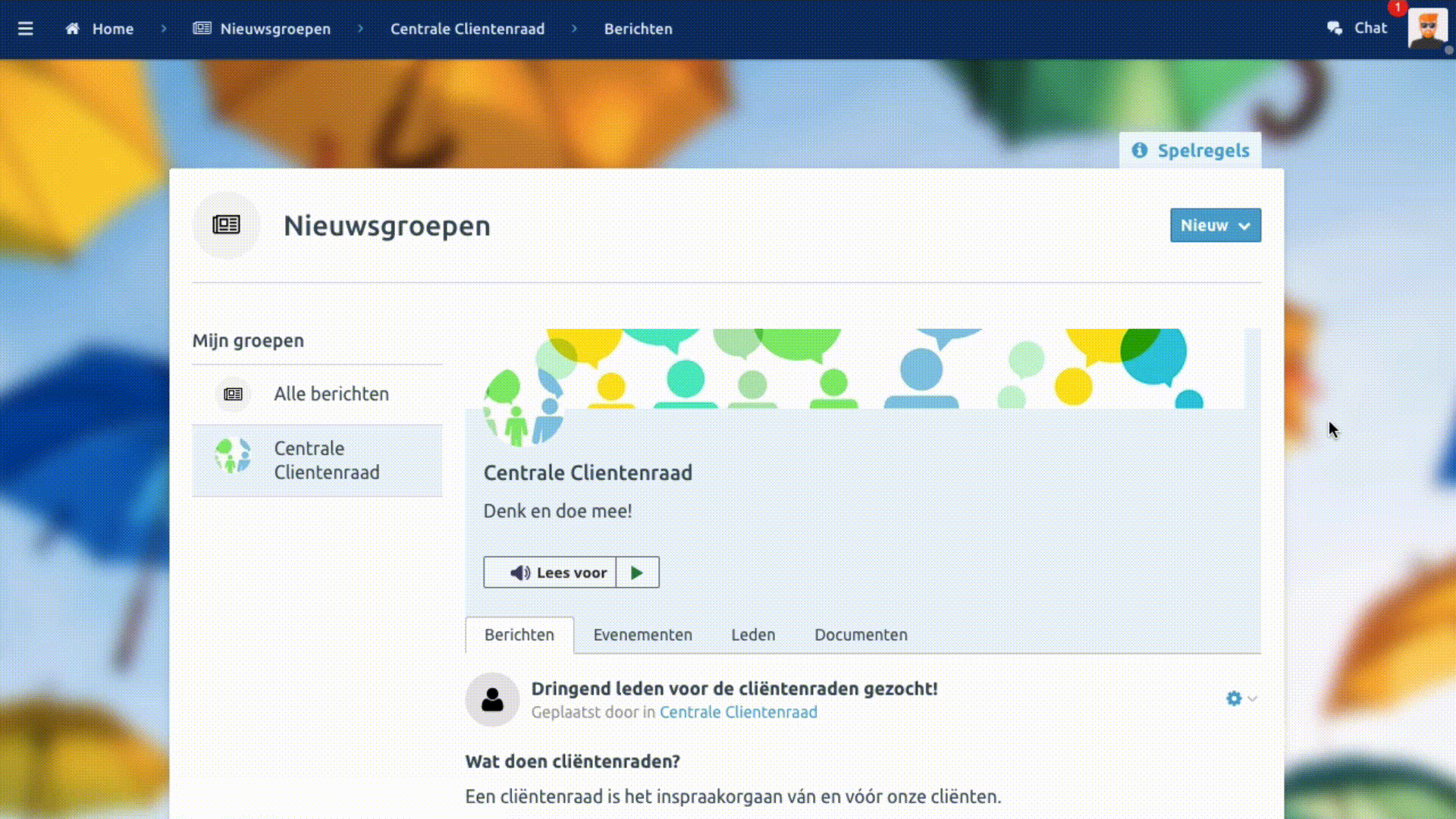 Ben je aan een nieuwsgroep toegevoegd, dan zie je Nieuwsgroepen (naam kan per organisatie verschillen) op je Dashboard in Jouw Omgeving. De eerste keer dat je inlogt, moet je eenmalig de spelregels accepteren. De spelregels zijn altijd rechts bovenaan in de tab te vinden, zodat je deze altijd kan teruglezen. Door op ‘Nieuw’ te klikken rechtsboven kan je een nieuw bericht of een nieuw evenement toevoegen: