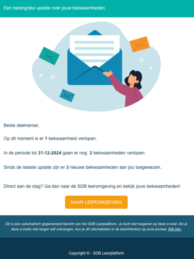 In het SDB Leerplatform worden e-mail notificaties verstuurd om gebruikers te informeren over bekwaamheden. Deze meldingen zorgen ervoor dat belangrijke gebeurtenissen, acties of herinneringen niet over het hoofd worden gezien. In dit artikel geven we een overzicht van de verschillende soorten notificaties die via ons portaal worden verzonden.