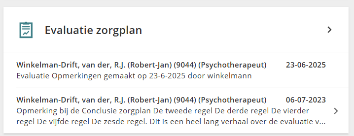Door op een tekst regel behorende bij een cliënt in de widget te klikken, wordt de gehele tekst getoond en kan worden genavigeerd naar de Voortgang module of naar het dossier van de cliënt.