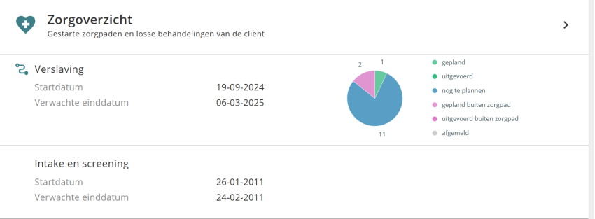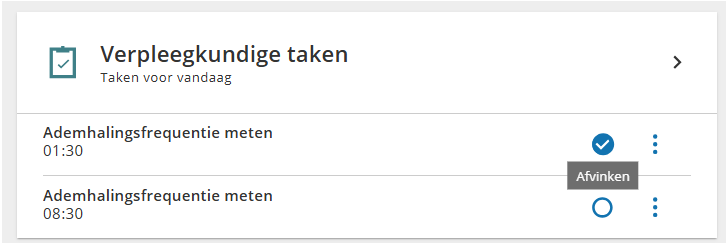 Verpleegkundige taken | Ontwikkeld voor de revalidatie. Middels de Verpleegkundige taken module is het mogelijk om vast te leggen welke taken voor een cliënt dienen te worden uitgevoerd. Bij het openen van de Verpleegkundige taken module worden de openstaande taken van vandaag getoond, gesorteerd op tijd van vroeg naar laat. Middels de Zoek balk kan worden gezocht op een taak en middels het uitgebreide filter is het mogelijk om te selecteren op alleen vandaag, datum vanaf, datum t/m en status (openstaand, uitgevoerd en zowel open als uitgevoerd). Indien een taak niet meer hoeft te worden uitgevoerd (bijvoorbeeld doordat een cliënt zichzelf al heeft aangekleed) dan kan een taak worden geannuleerd middels ‘Taak annuleren’ onder de drie puntjes. Indien een taak onterecht is aangemaakt dan kan deze worden verwijderd middels ‘Taak verwijderen’ mits de taak in de toekomst ligt en de gebruiker de rol VPK_VERWIJDER heeft. Rollen: VPK_TAAK_LEES (Geeft toegang tot de module verpleegkundige taken met leesrechten) VPK_TAAK (Geeft toegang tot de module verpleegkundige taken met schrijfrechten) VPK_VERWIJDER (Maakt het mogelijk taken te verwijderen in de module verpleegkundige taken. Zonder deze rol kunnen taken alleen geannuleerd worden met opgaaf van reden) | Ja |
