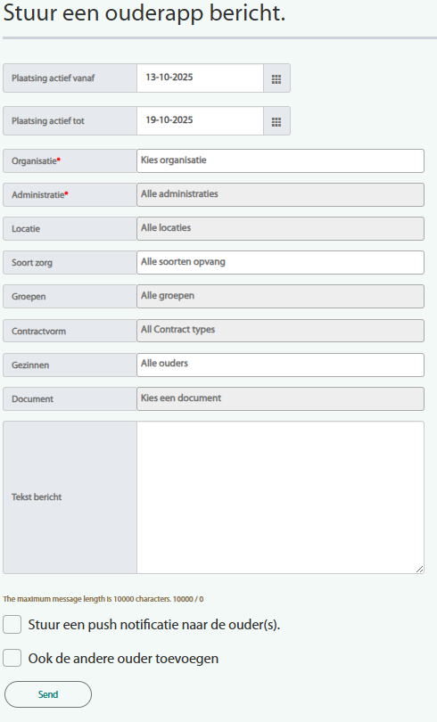 Deze functie kan gebruikt worden om via de webapplicatie een bericht te sturen op basis van een selectie naar de ouderapp van de ouders.