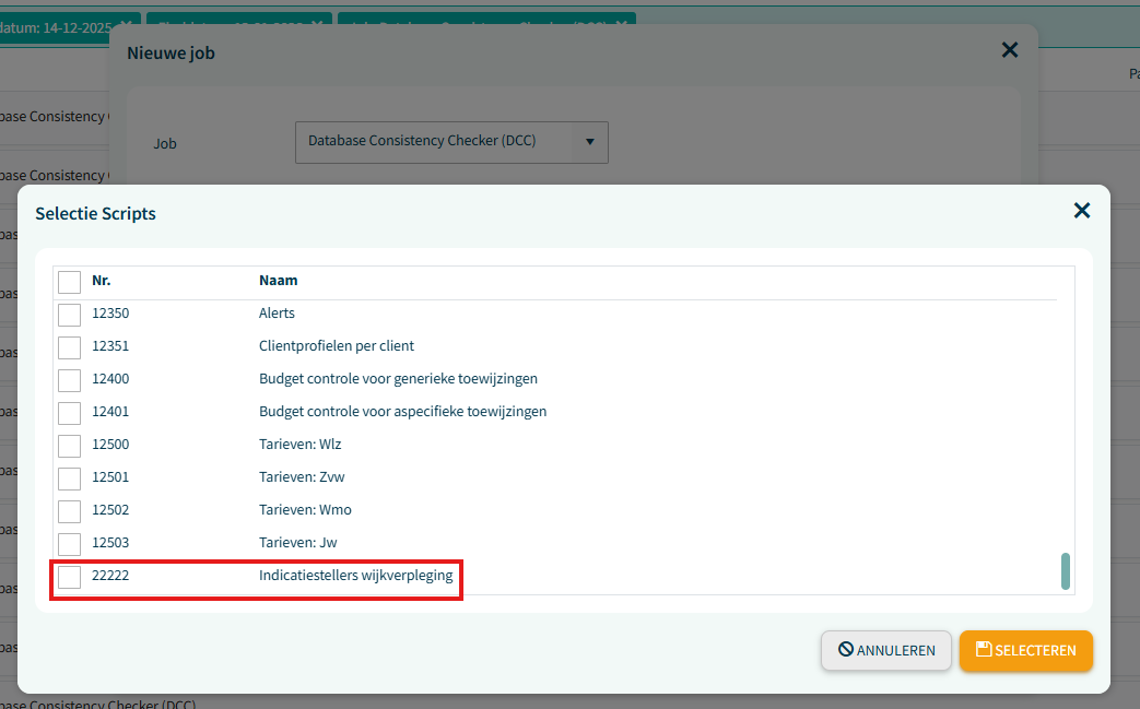 Kies binnen de job voor het script ‘Indicatiestellers wijkverpleging’ (nummer 22222) en stel de gewenste begin- en einddatum in om de periode te bepalen waarover je de indicatiestellers wilt opvragen.
