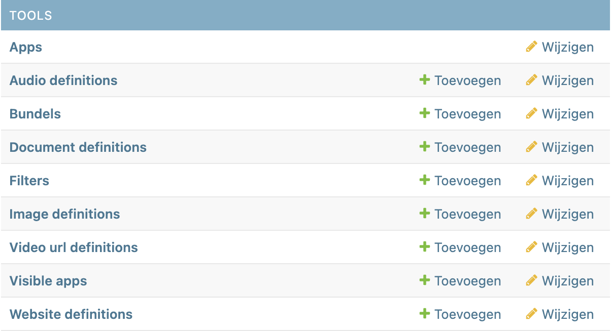 Tools is onderdeel van de sysadmin-omgeving en wordt gebruikt voor het beheren en configureren van de hulpmiddelenbibliotheek. Toegang tot dit onderdeel is alleen mogelijk met de juiste rechten. Deze rechten verkrijg je door het volgen van een training.