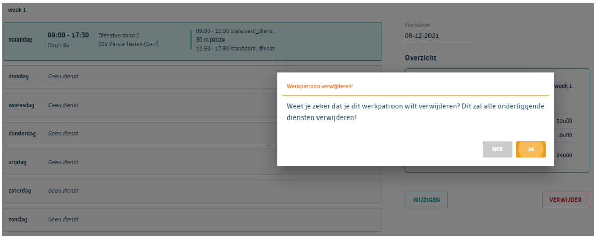 Wanneer een Werkpatroon wordt verwijderd zullen alle diensten en afwezigheden die zijn aangemaakt
