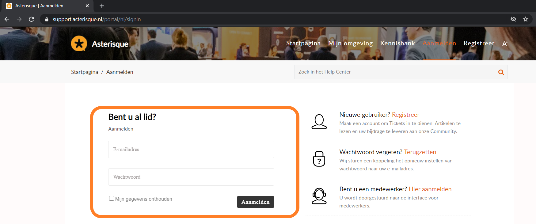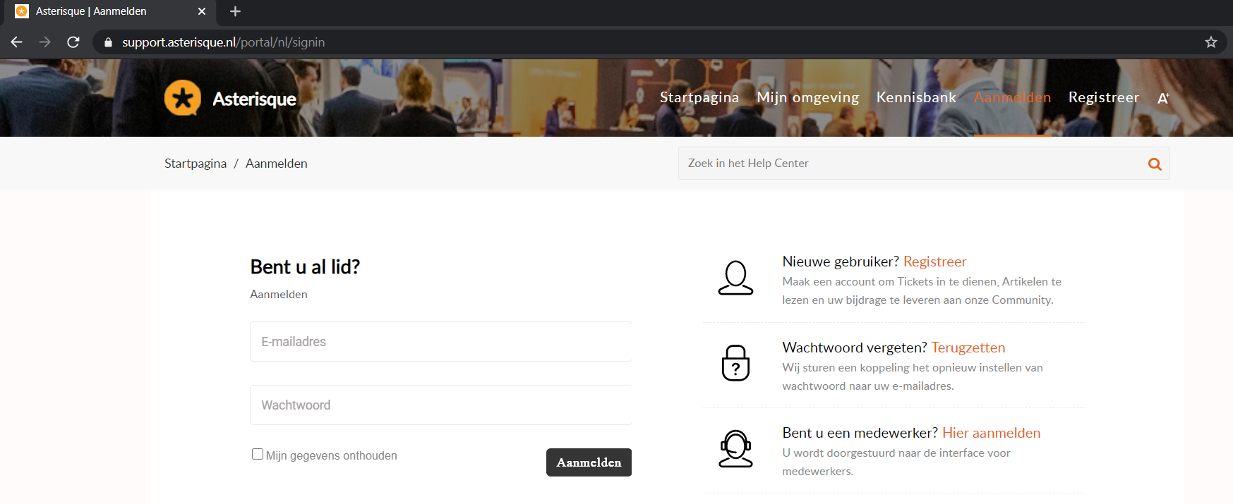 Geef de volgende url in om u aan te melden voor de self-service portal: http://support.asterisque.nl/