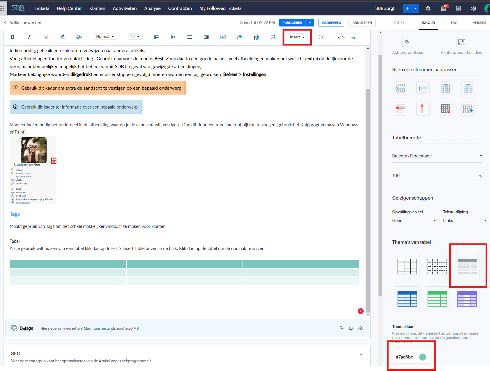 Als je gebruik wilt maken van een tabel klik dan op Insert > Insert Table boven in de balk. Klik dan op de tabel om de opmaak te wijzen en klik op Grijs Thema voor het thema van het tabel. Gebruik de themakleur #7AC6BC.