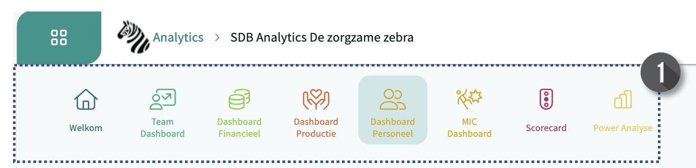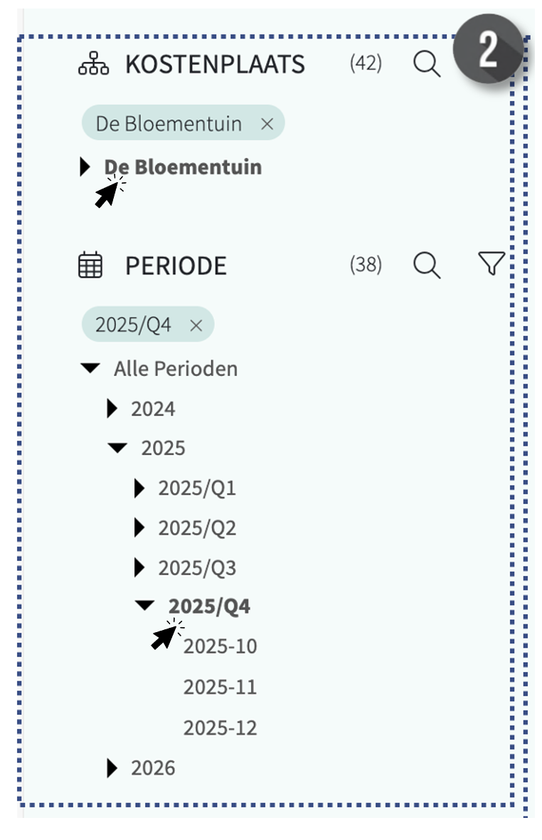 - Klik op het pijltje naar beneden [v], links bovenin het rapport, om een slicer (filter) te openen en te gebruiken