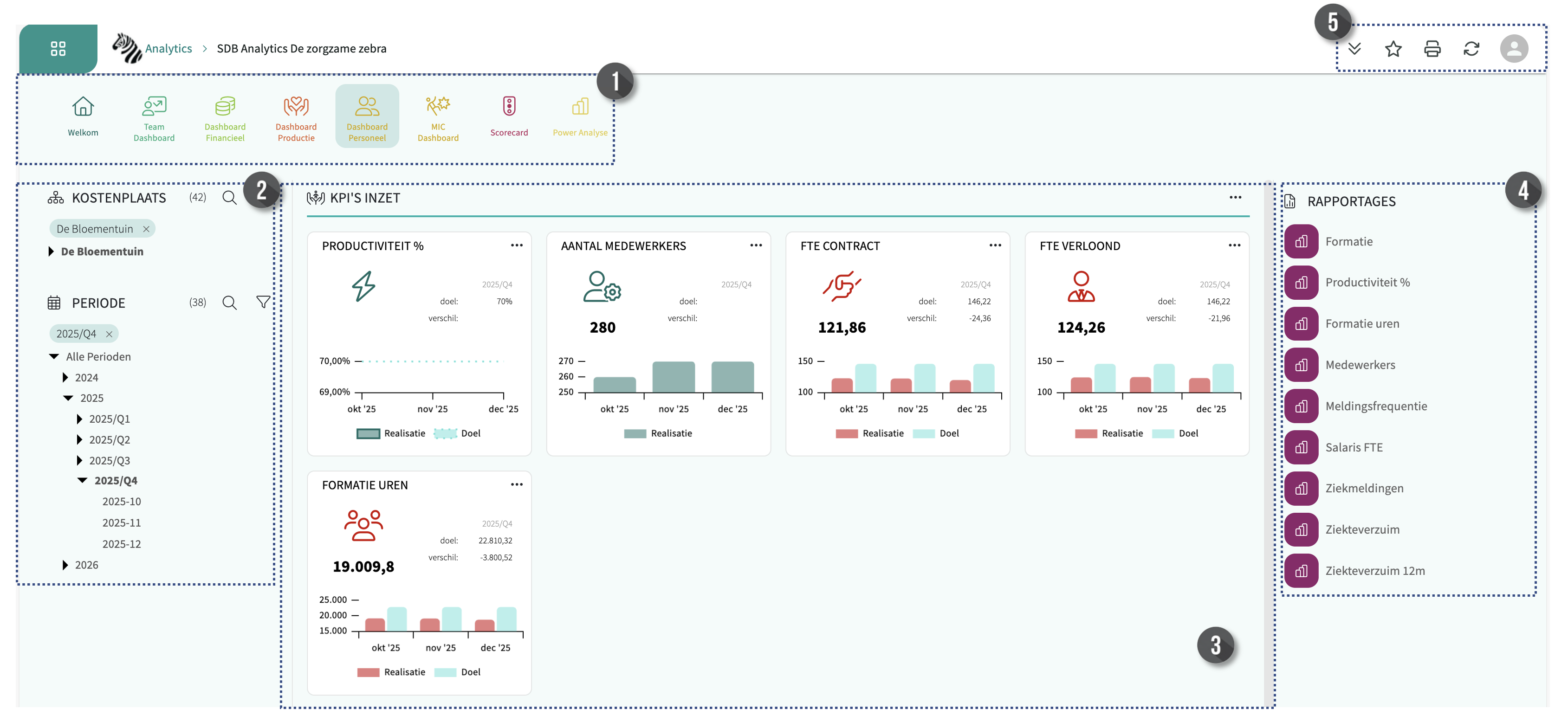 De KPI dashboards in InTouch helpen je om belangrijke prestatie-indicatoren (KPI’s) van je organisatie te volgen. Op het KPI dashboard staat een verzameling KPI-tegels gerelateerd aan het thema van het dashboard. Elk dashboard is aangepast aan jouw organisatie en toont de KPI's waarop jouw organisatie stuurt. In het voorbeeld van het Dashboard Personeel zie je 5 KPI's: productiviteitspercentage, aantal medewerkers, FTE contract, FTE verloond en formatie uren.
