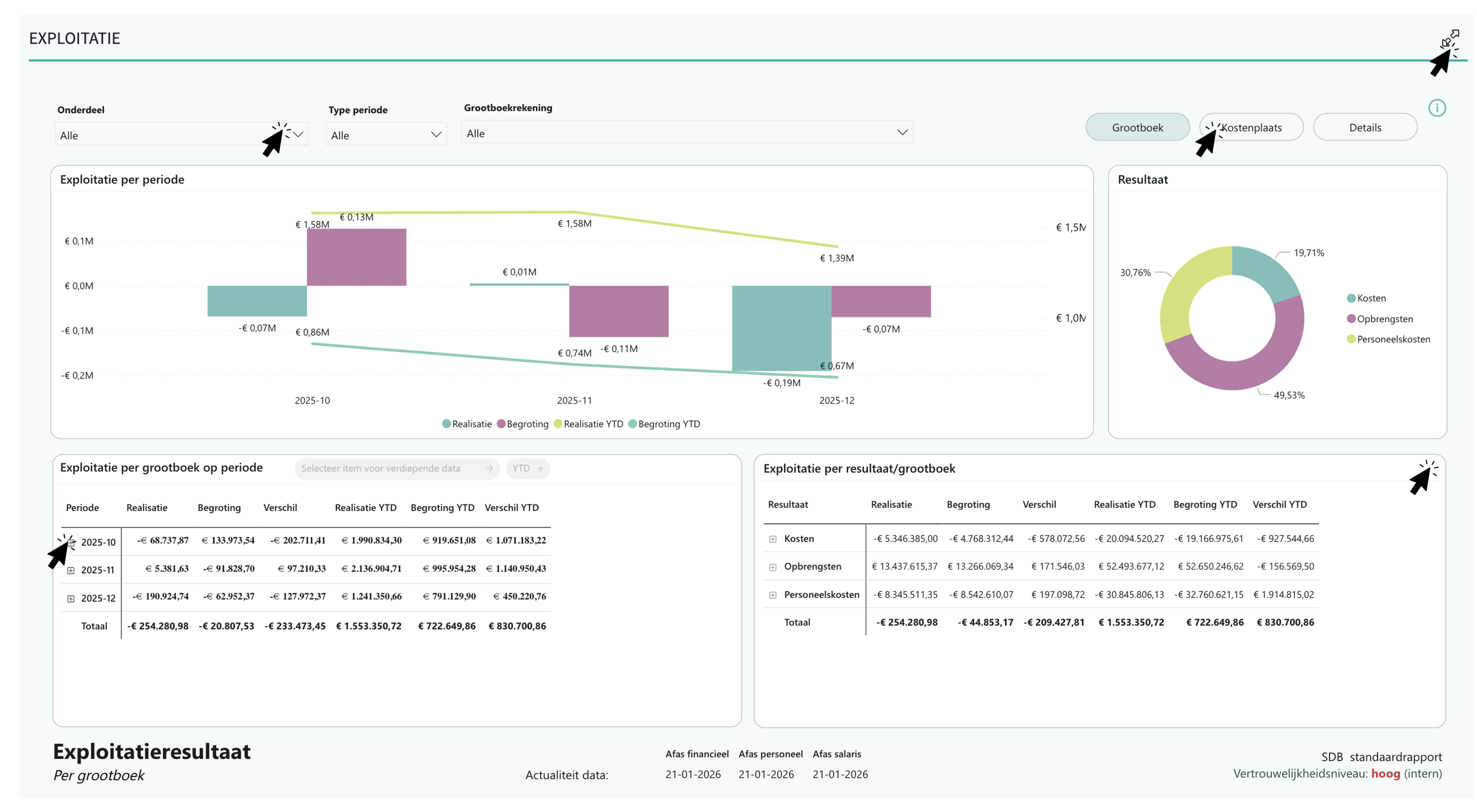 Een detail rapport (in dit geval een Exploitatie rapport) bevat vaak visualisaties en tabellen voor meer verdieping over het onderwerp. Een aantal tips: