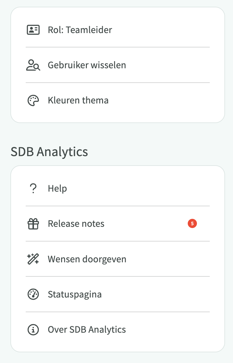 Rechts bovenin je scherm zie je een aantal knoppen. Helemaal rechts staat een poppetje. Hier vind je de mogelijkheid om van rol te wisselen (als je er meer dan één hebt) of InTouch in andere kleuren in te stellen. De kleuren die je ziet na het inloggen zijn meestal de kleuren van de huisstijl van jouw organisatie.