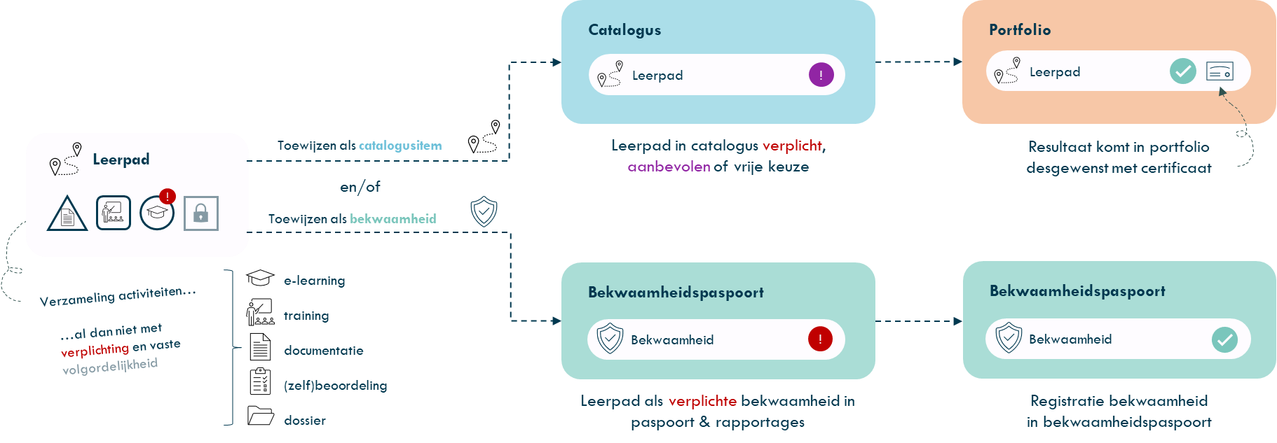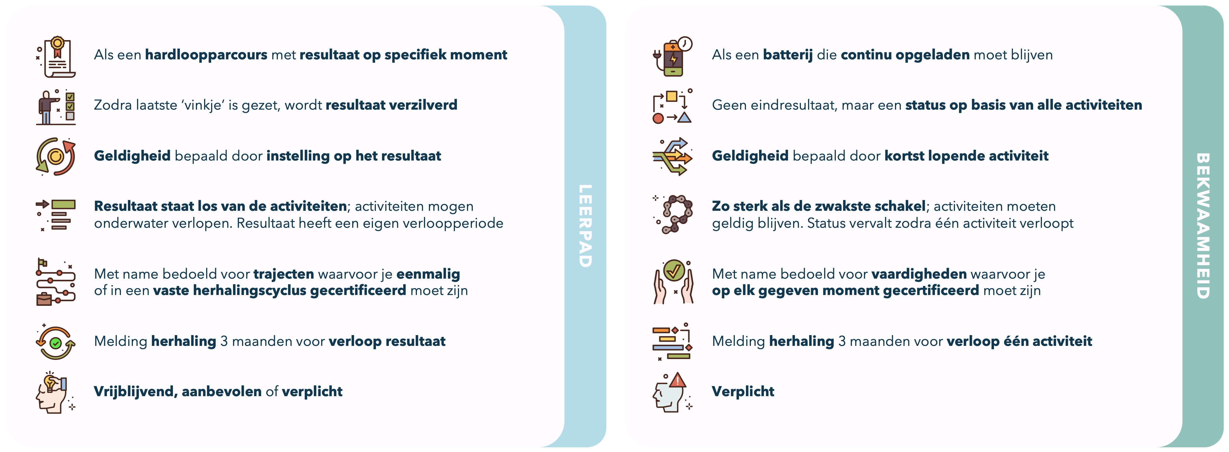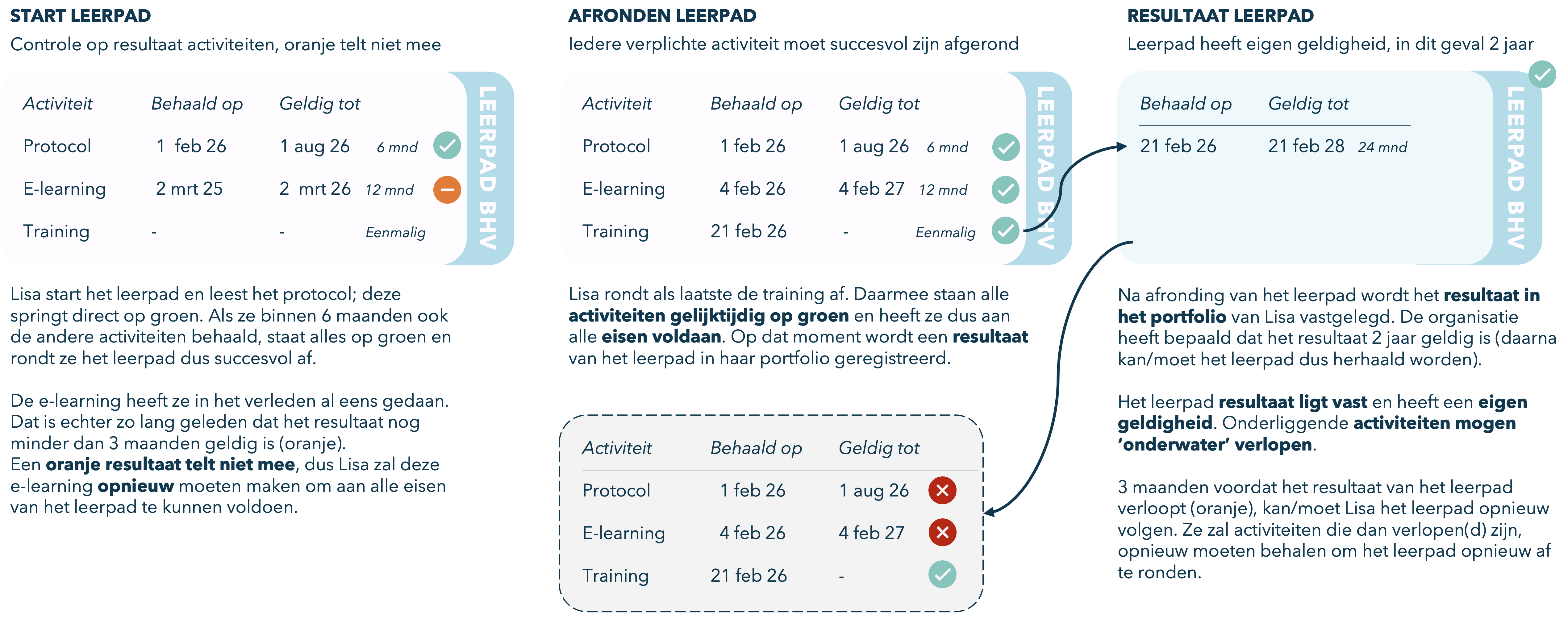 Hieronder een illustratie van de weg die uiteindelijk bepaald of het leerpad en/of bekwaamheid wordt. Een leerpad vormt het startpunt. Het bestaat uit een verzameling activiteiten, zoals e-learning, trainingen, documentatie en (zelf)beoordelingen. Deze activiteiten kunnen een vaste of vrije volgorde hebben en zijn soms verplicht. Afhankelijk van de inrichting worden ze eenmalig afgerond of blijven ze geldig voor een bepaalde periode.