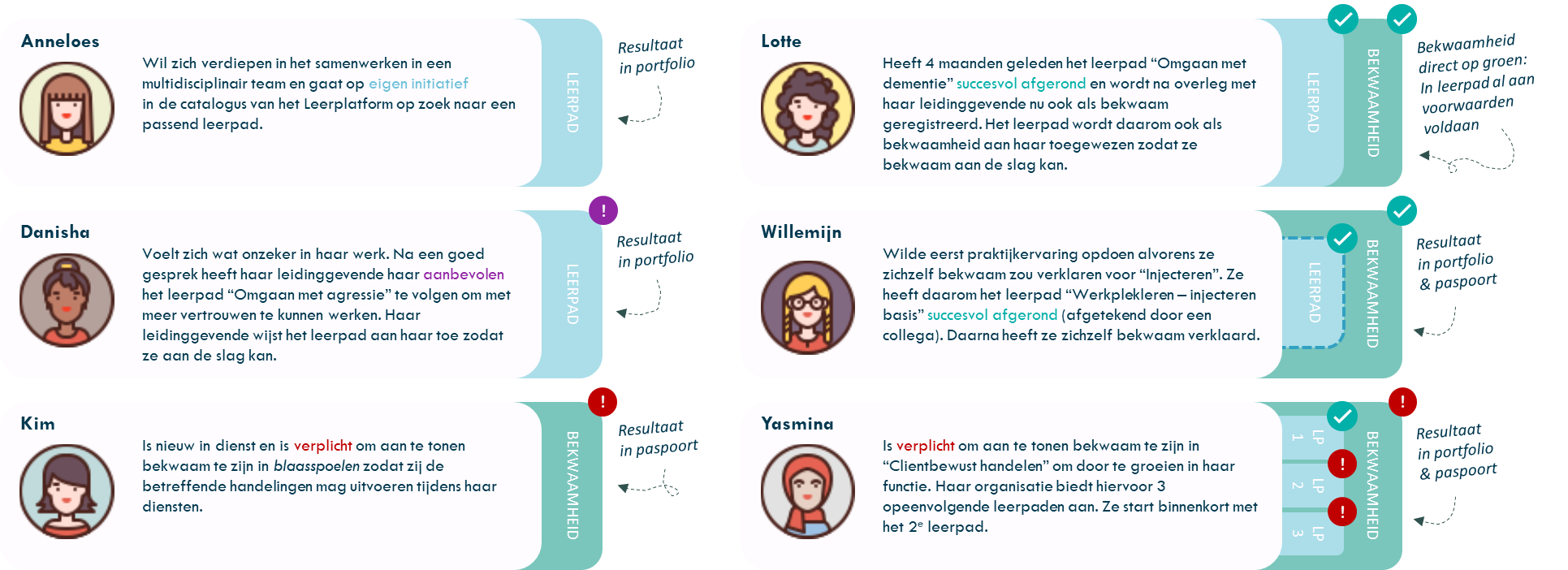 Iedere medewerker start vanuit een andere situatie. De één kiest zelf een leerpad om zich verder te ontwikkelen, de ander krijgt een leerpad of bekwaamheid toegewezen vanuit het team of de organisatie. Soms is leren vrijblijvend, soms verplicht en soms is het een combinatie van beide. Deze voorbeelden laten zien hoe medewerkers op verschillende manieren gebruikmaken van leerpaden en bekwaamheden. Ze maken zichtbaar hoe keuzes, begeleiding en verplichtingen samen bepalen welke route iemand volgt en hoe resultaten worden vastgelegd in het portfolio of het bekwaamheidspaspoort.