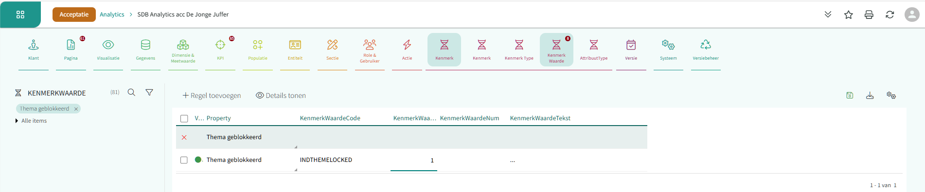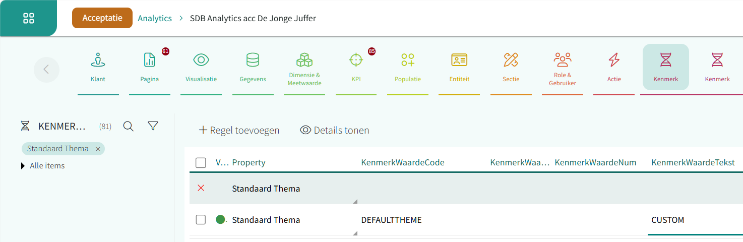 - Pas de waarde KenmerkWaardeTekst aan naar de KenmerkwaardeCode van het thema van de organisatie (dit is de bedrijfskleur en kent de code CUSTOM).