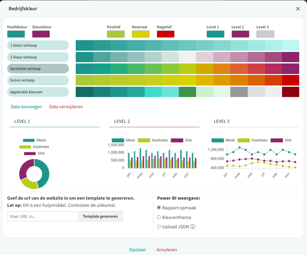 - 'Upload JSON' = De opmaak die gebruikt wordt in het Power BI JSON thema bestand wordt gebruikt.