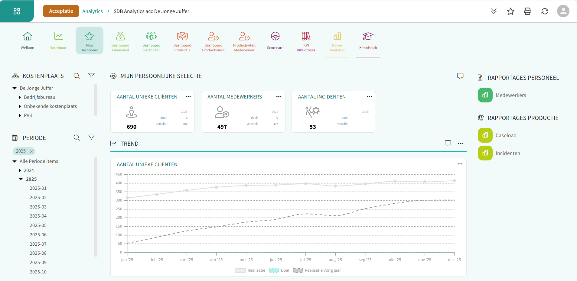 - Level 2: deze kleur zie je terug in de headers van slicers organisatie/kostenplaats en periode (het is net mogelijk om de kleur van de tekst in deze slicers aan te passen, hou hier rekening mee in je kleurkeuze. De tekstkleur is altijd wit)