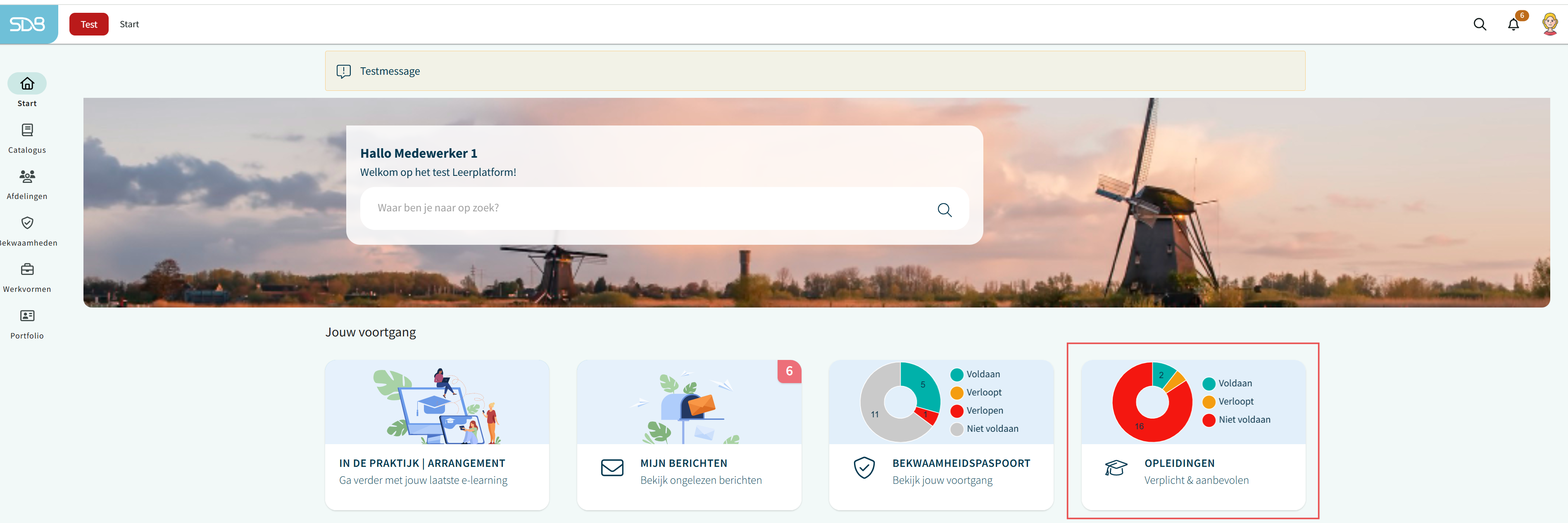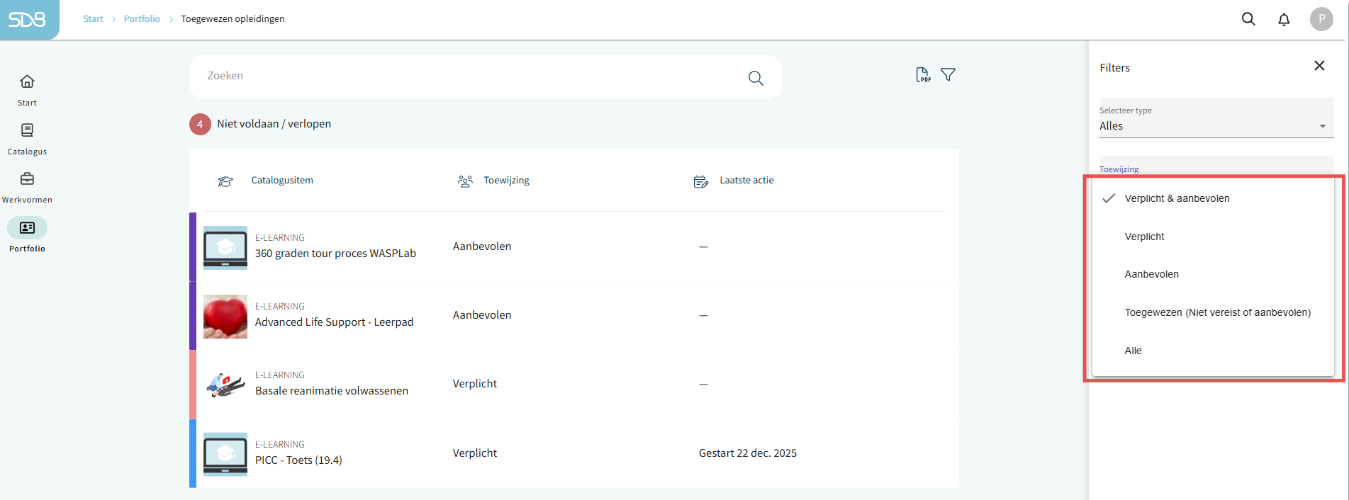 De medewerker kan in één overzicht makkelijk zien welke verplichte en aanbevolen opleidingen nog gedaan moeten worden. Ga hiervoor naar Portfolio> Toegewezen opleidingen