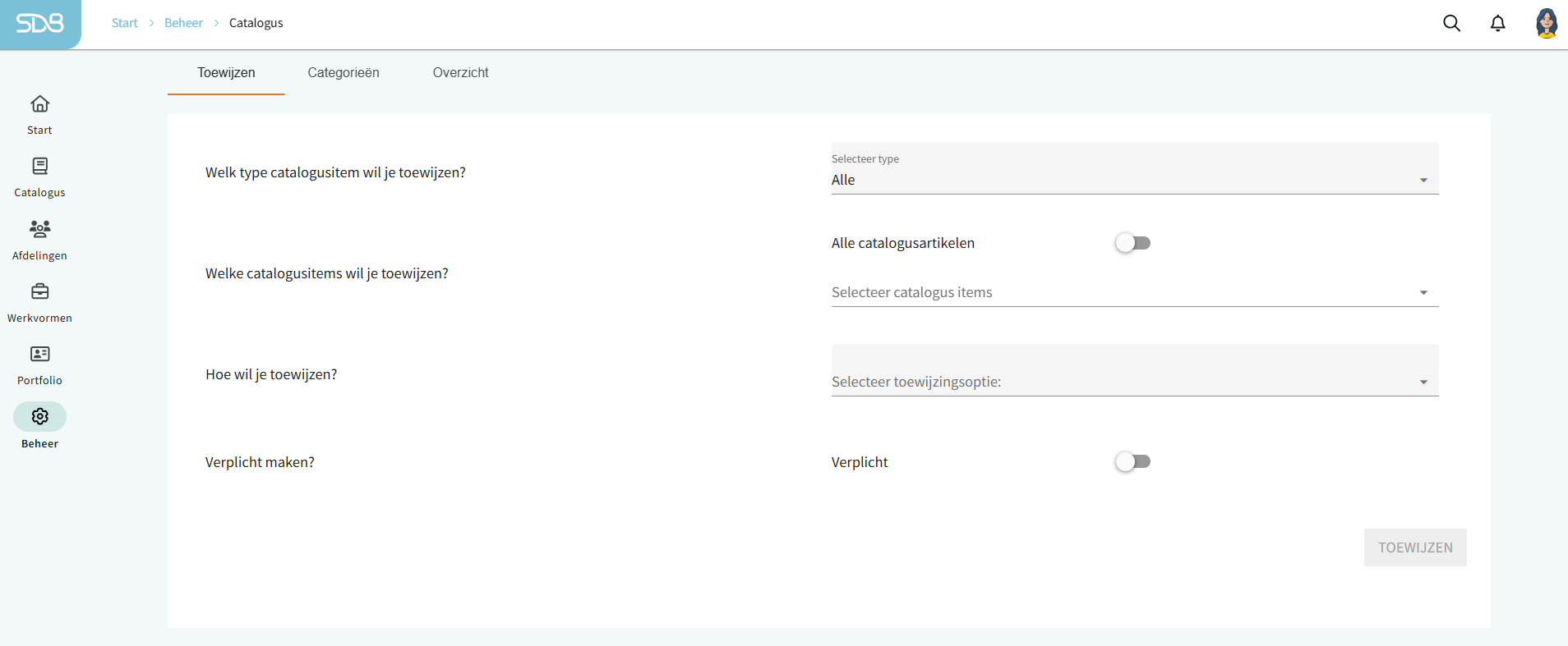 Let op: deze vraag wordt niet getoond indien de algemene instelling via Beheer > Instellingen > Algemeen > Applicatie onderdelen > filter 'Verplichte toewijzingen' niet geactiveerd staat in het portaal.