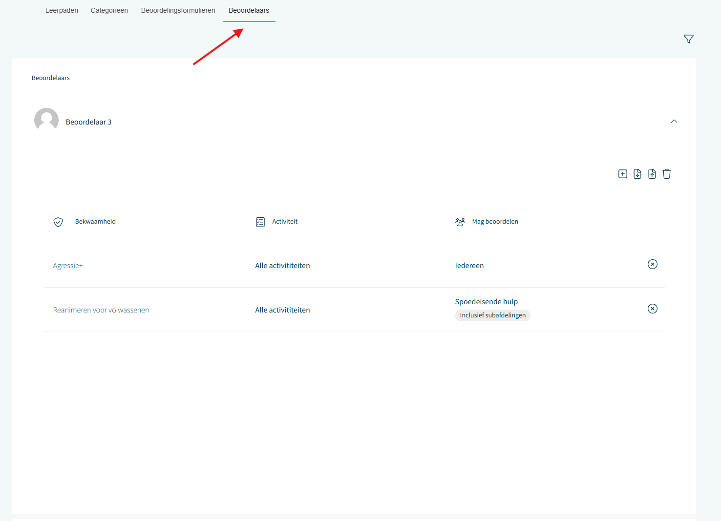 Via het tabblad Beoordelaars binnen Bekwaamheden kunnen beheerders beoordelaars beheren en inzicht krijgen in de specifieke bekwaamheden, activiteiten, afdelingen en functies waaraan een beoordelaar is gekoppeld. Dit geeft volledige controle over de toewijzingen.