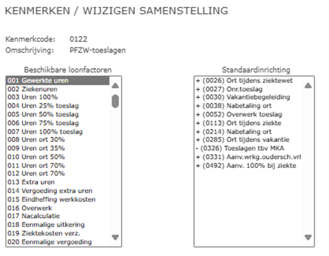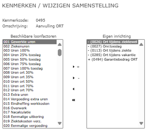 links alle beschikbare loonfactoren staan, die vervolgens met de knoppen “–“