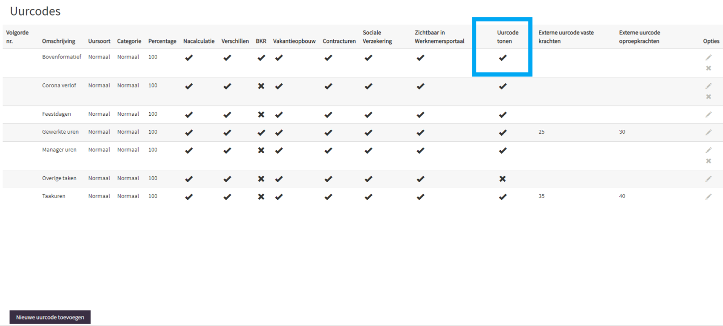 Mocht een uurcode niet meer in gebruik zijn dan kan deze uitgezet worden door het vinkje uit te zetten bij uurcode tonen.